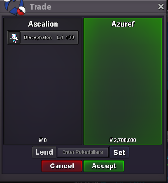 Payments: Pokedollar Coin Capsule = 480k Reroll Ticket = 700k Nature Reroll Ticket = 350k IGN: YNOSVT Discord: YNOSVT Pokemons: TMs: TM179 - Trailblaze 20k TM313 - Earth Power 20k TM304 - Aura Sphere 20k TM230 - Flip Turn 50k TM192- Snowscape 50k I may have more TMs, please ask in game, here I listed only the most popular ones Orbs: 30k/e Choices: 50k/e