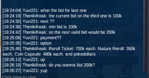 Start Price: 20m End: 5 days after first bid Insta Price: 60m Minimum Raise: 1m Accepted Payments: pokedollars, cc (500k), ivs rr (700k) 15 minutes rule GL for all