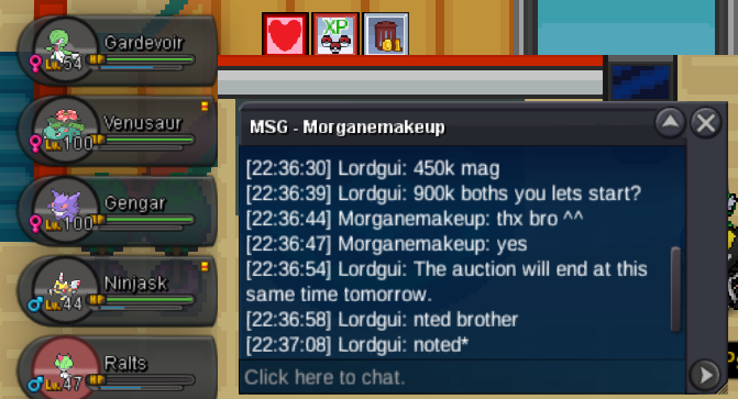 Start Point: 300K End Point: 30 hours after the first bid Insta: N/A Min. Raise: 50K Accepted Payment(s): Pokedollars, Coin Capsule 500K each