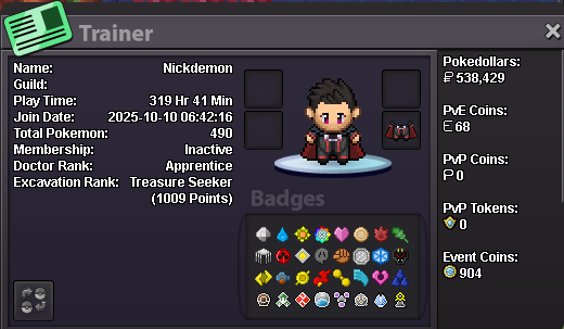 what can you contribute to Dynasty? Currently not much besides being an active user at least 5 days a week since my account is 1 month old. My goal is to finish all the end game PvE content and then focus on farming for PvP teams. I'd like some some guidance on PvP though since I have no experience but I have lots of top level competitive CCG experience (turn based gameplay, opponent reading) so it would be easy for me to learn with some help (team building, why pokemon use certain moves and what role do they fit in the team, meta, etc) what is your real life and ingame name? Nick - NickDemon (wow, very imaginative) how old are you and where are you from? 29 - Greece discord tag? how often are you online there? nickdemon33 - Usually after 13:00 GMT but mostly on mute, feel free to spam my DMs in order to reply screenshot of your trainercard -