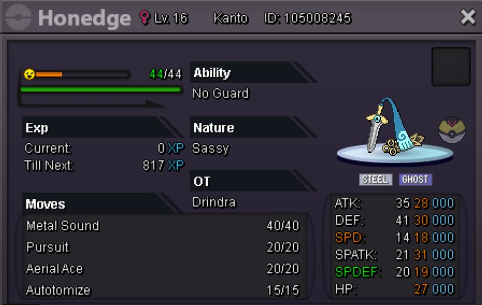 Details: Start Price : 500k Min Bid: 100k Insta: n/a End point: 48 hours after initial bid Accepted Payment: Pokedollars, Coin Capsules (x1 Coin Capsule = 500k) This is a silver Server auction. You may bid from any server but you must transfer to silver Server upon winning the auction. You may place bids here or in game. The 15 Minute rule will go into effect if a bid is placed in the last 15 minutes