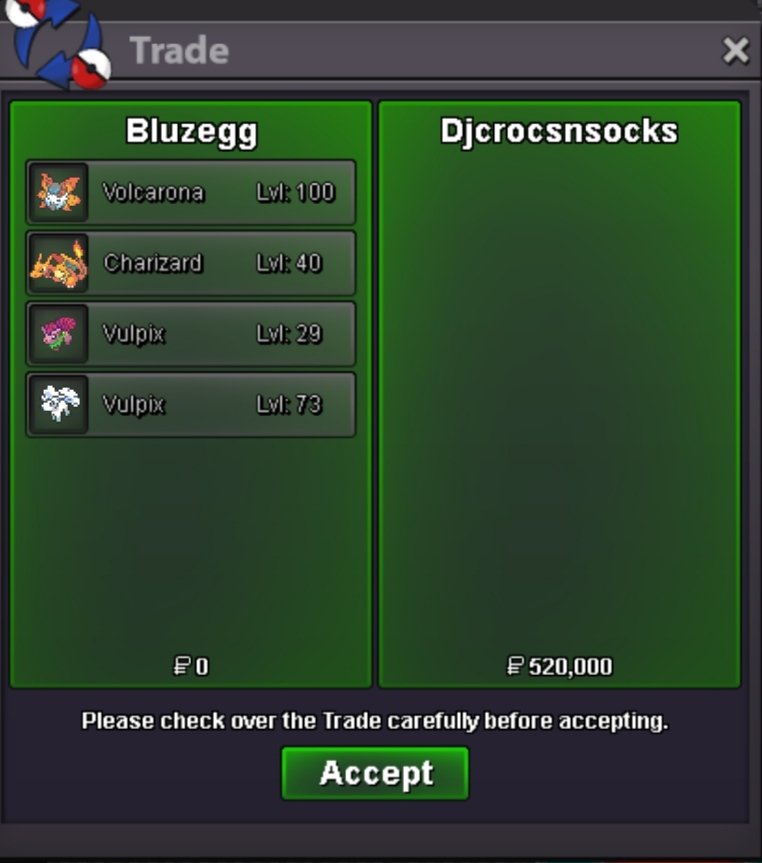 10. Starting the auction : 1M Minimum bid : 100k Instant sale : No The auction will end 72 hours after the first bid. Accepted payments: Pokedollars Reroll Ticket: 600k each. Coin Capsule: 450k each. Black Medallion: 225k each. TIME: