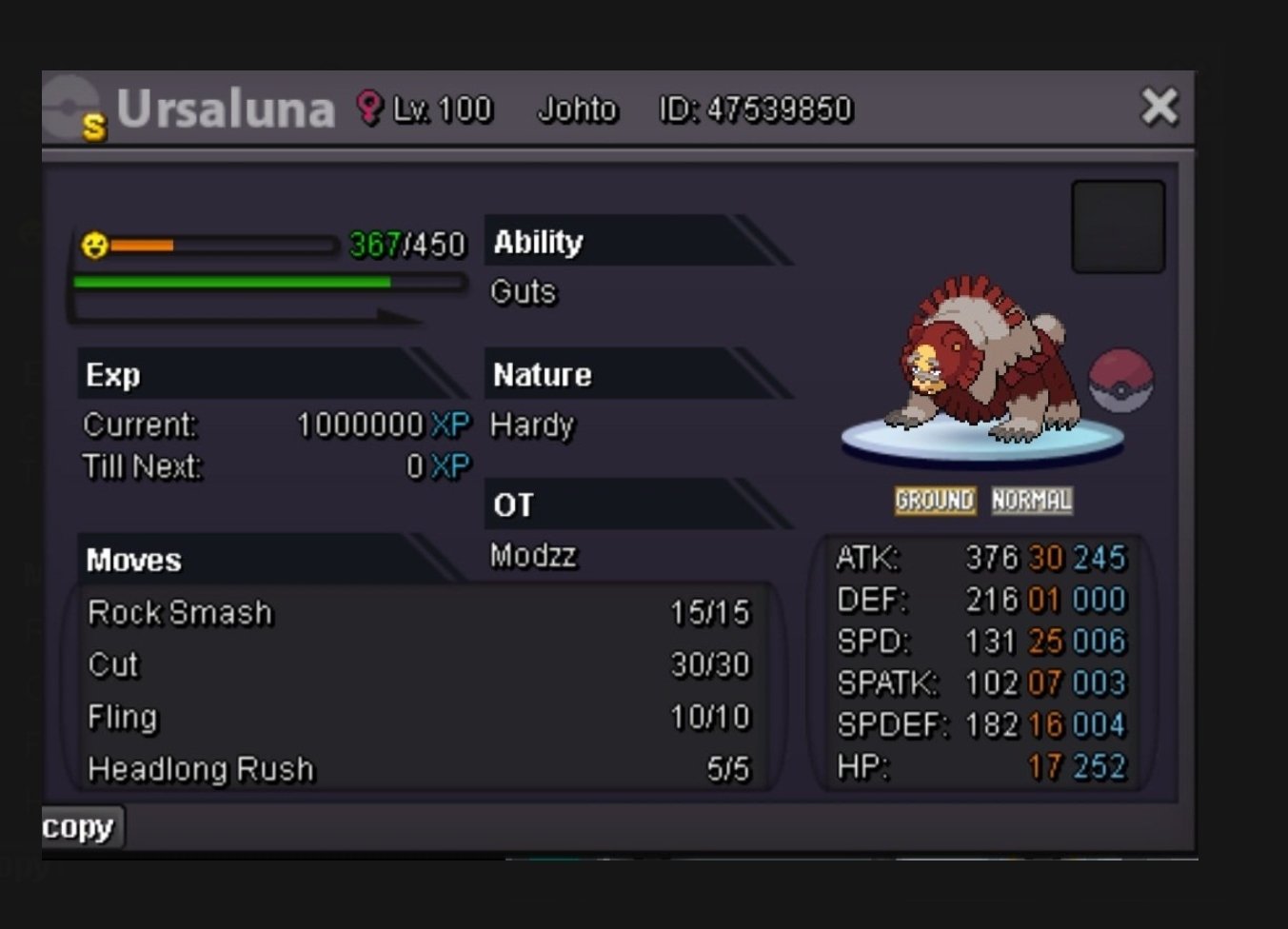 6. Auction: Shiny Ursaluna Server: Silver Duration: 48h from first bid Pokemon: Shiny Ursaluna Nature: Hardy Ability: Guts Level: 100 Start Price: 300k Min Raise: 200k Accepted Payments: Pokedollars Coin Capsules (rate = 450 each) Rules: 48h countdown starts from first valid bid No fake offers / No retracting bids IGN: Alazme