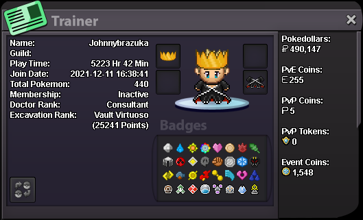 Hello there! My IGN is Johnnybrazuka, I'm 31 years old and I live in Rio de Janeiro, Brazil. My total playtime is 5223h. I enjoy hunting strong Pokémon to build a decent PvP team (although I'm not so experienced in PvP, I want to learn), but my favorite thing on PRO is doing some PvE activities. I have over 3 years of experience with dungeon runs, whether solo or party. My first ever dungeon was when I started playing PRO in December 2021, in the Xmas dungeon in order to acquire Reshiram and Zekrom, and I got both with Xmas skins. Also, I like to do Excavation and bosses to farm a lot of PvE Coins. Some of my best Pokémon I got from bosses, Excavation or Lavender Dungeon solo. I can offer some EV and level service, I'm not experienced about giving prices, but I can help training some Pokémon, if needed. Also, I want to join on the dungeons to help the guild on farming points for the dungeon ladder. Although I can run Lavender dungeon solo, I can help on party dungeons, like Victini and Pinkan dungeons, for example). And to finish, my favorite Bidoof form is Endoof, because it's the Bidoof form of my most favorite Legendary Pokémon. -