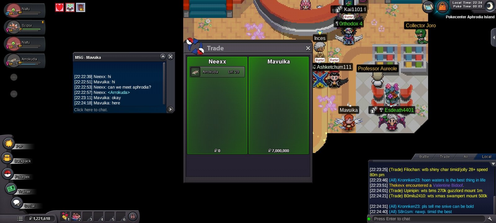 I am currently transferring the Arrokuda. I'll pm you in-game with my alt Neexx at gold. -