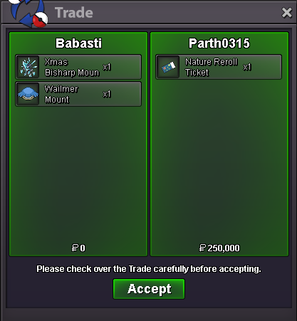 Start Price : 5M Insta Price : 20M Current Bid : Min Bid : 500K End Point : 72hr after start price IGN : Lor3hc Auction Details - This is a Gold Server auction. If bidding from an alternative server, state that you will transfer upon winning. - If you intend to purchase with an alt account, specify the account alongside your bid. - If a bid is recived in the last 15 minutes of the auction, the end point will be delayed by 15 minutes from that bid, and will be delayed by 15 minutes for each new bid thereafter, until the current bid has been held for a full 15 minutes. Accepted Payments Pokedollars Coin Capsule (500k ea) Reroll Ticket (750k ea) Nature Reroll Ticket (350k ea)