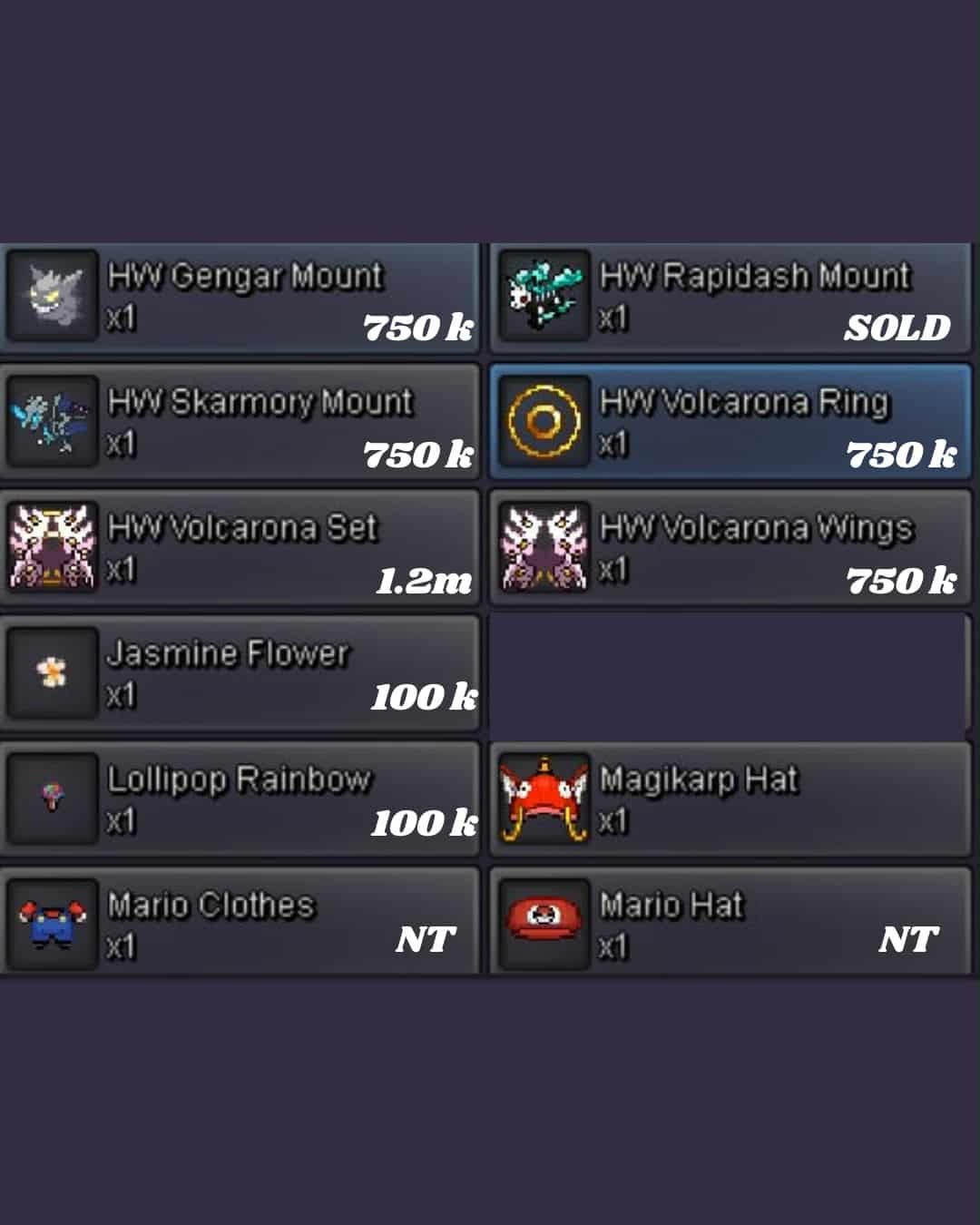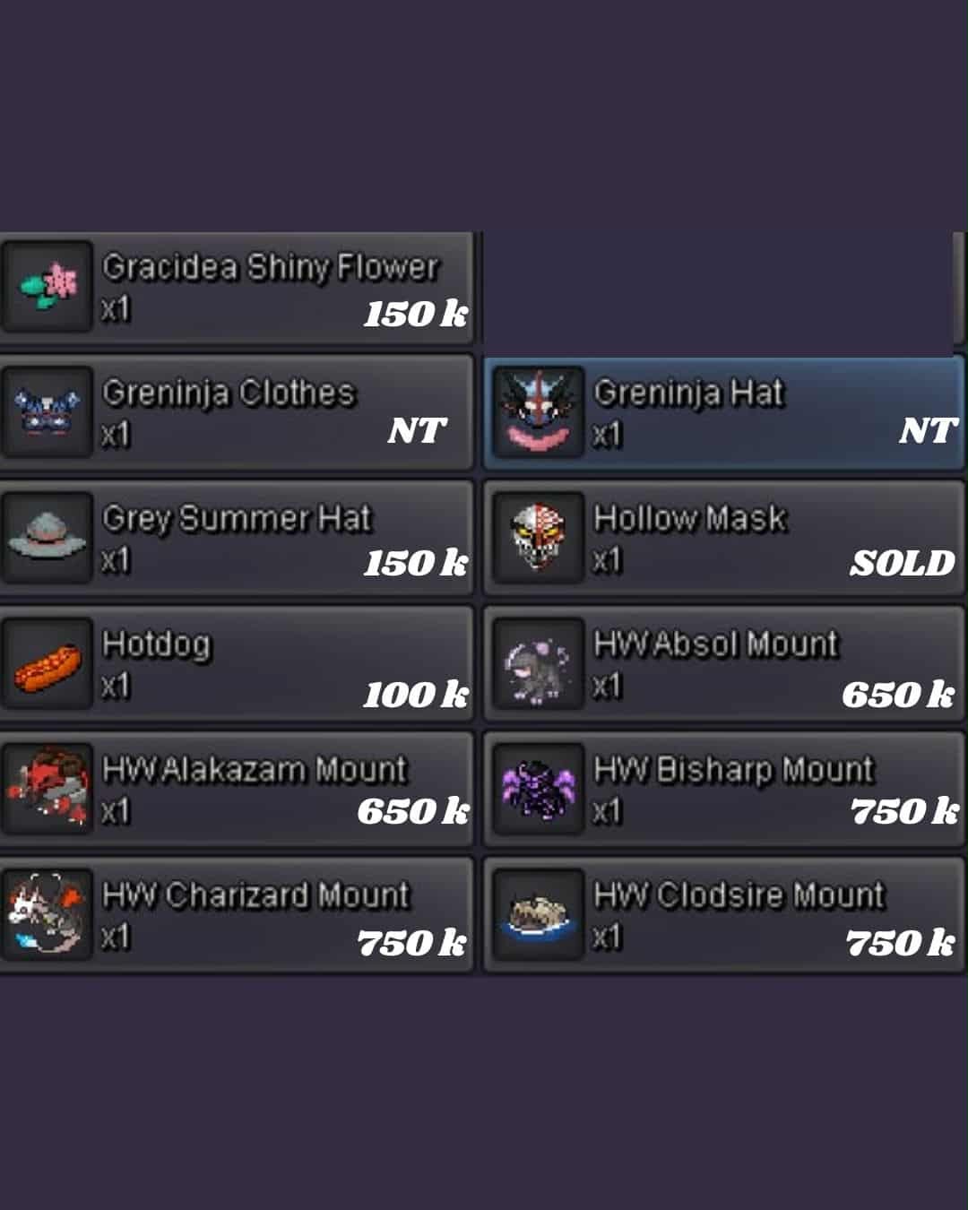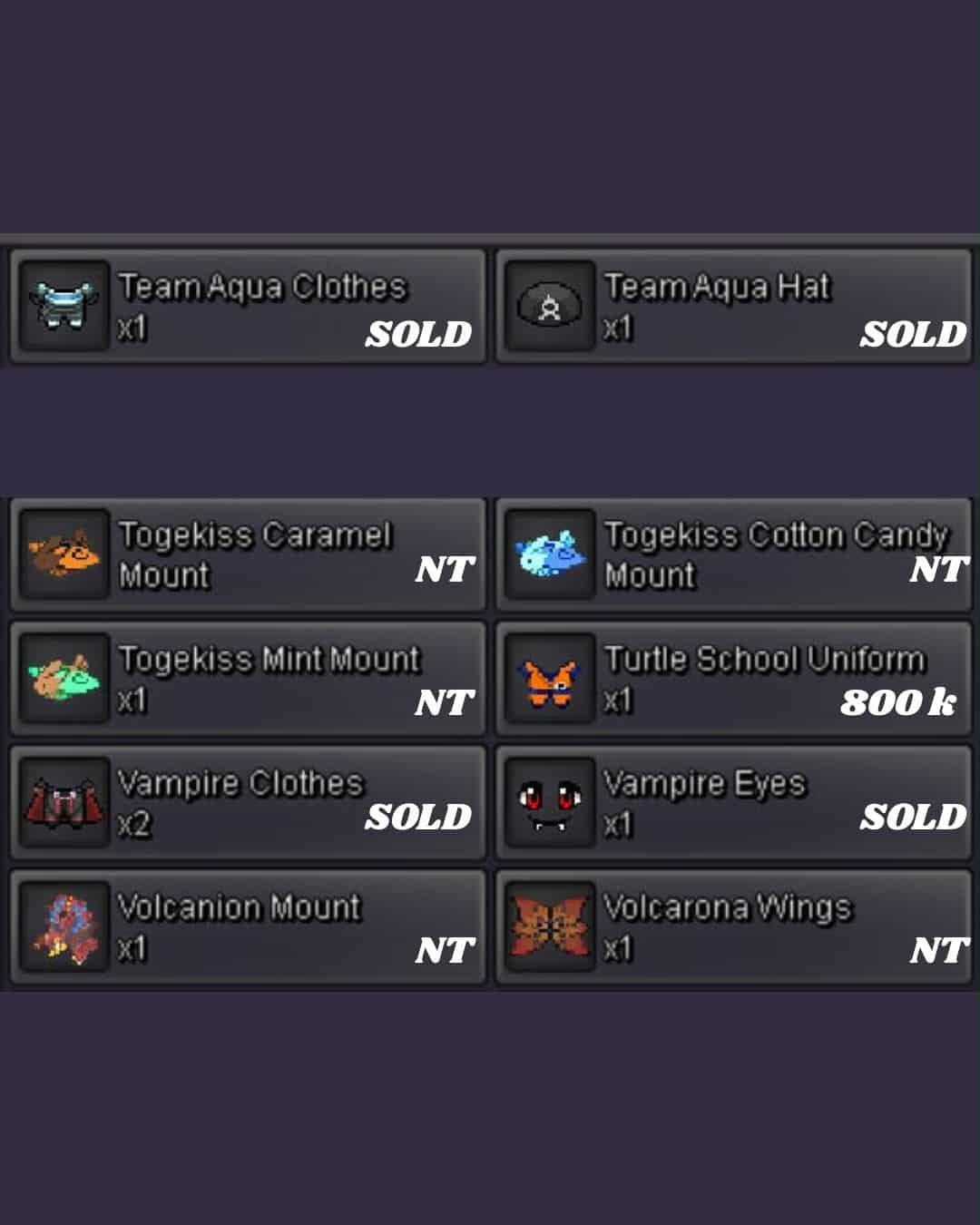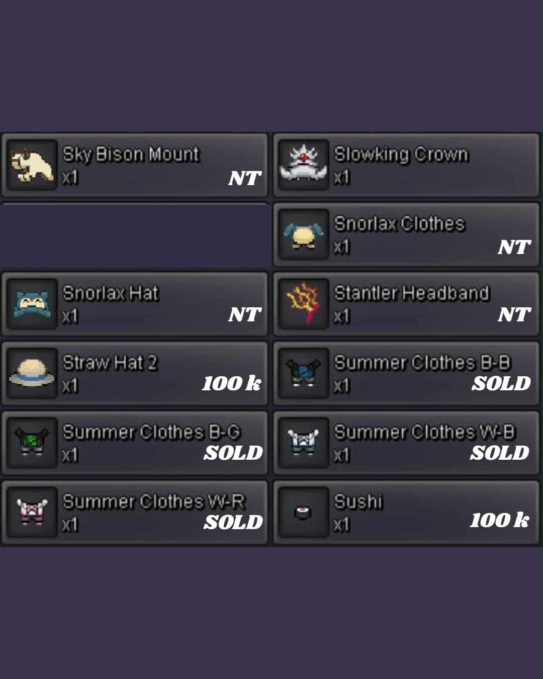 Store policy 1 - Items with the word "NT" are not for trade 2 - There are no refunds and fake offers will be reported 3 - The customer is allowed to contact Yayozama through discord or pro to make business 4 - Prices are not fixed so customers can make offers 5 - The store accepts as forms of payment the following: Pokepesos Coin Capsules - 450k Reroll Tickets - 700k if u are latino u get a 5% discount Most trades realized in Vermillion City, Kanto. There can be some exceptions If I miss a comment for a sale please dm me on discord @yayozama and we'll line up a time