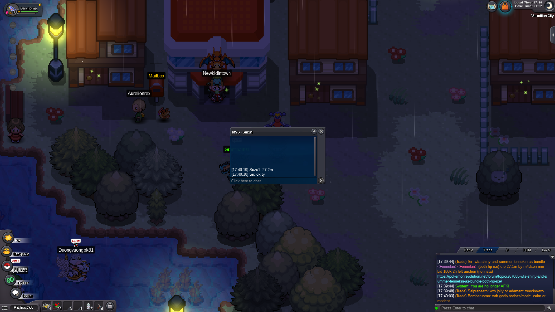 Rules: - Fake offers will be reported instant - Prices of Pokémon's are not fixed they can be negotiated. - I have rights to reject offers. - Mixed payment is available. - 10% discount if 3 or more are purchased. - for fast trade pm in discord : (Recommended) Payments Pokedollar Coin Capsule = 500k Reroll Ticket = 750k Nature Reroll Ticket = 350k Rare Candy = 6k [hidden="Normal Pokemon"] [/hidden] - > Normal Pokemon lvl > 95 - > Event/Shinies/Pinkan - > Summer - > Halloween - > Star Wars - > Easter - > Valentine's Day - > Christmas - > EV/LVL100 Normal Pokemon 100k - > EV/LVL100 Special/Rare Pokemon -> Cosmetics - > Mounts
