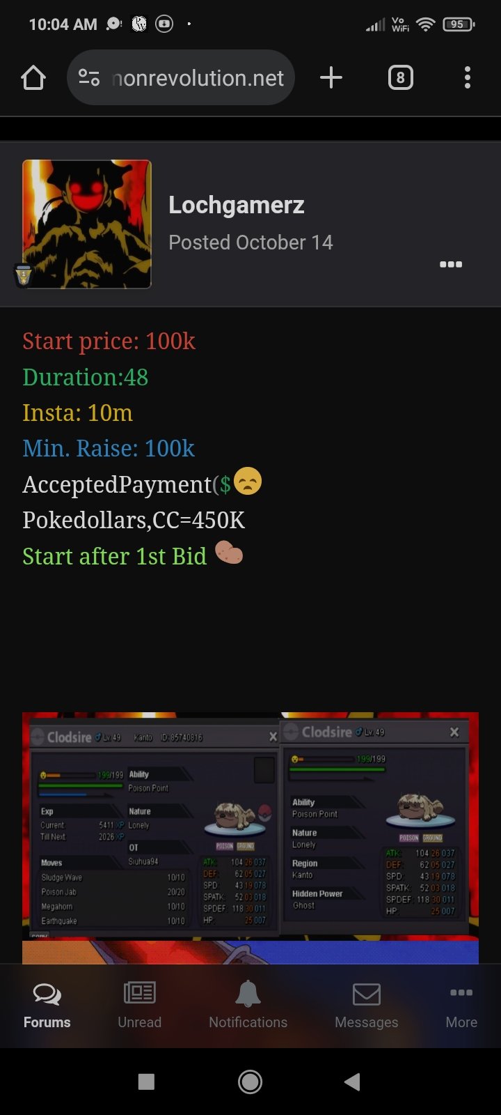This is seperate auction for each of these: Duration: 24hrs after first bid for each mon (GMT -6) Payment Option: Pokedollar, CC=500k, IV Reroll = 700K Skarmory: S.O: 1m Min bid: 100k Insta: 2.5m Duration 24hr after first bid Brave Munchlax S.O: 200k Min bid: 50k Insta: 1m Duration 24hr after first bid 2024 HLW Gastly S.O: 100k Min bid: 10k Insta: 400k Duration 24hr after first bid HLW Paldean-Wooper: S.O: 200k Min bid: 50k Insta: 800k Duration 24hrs after first bid NOTE: -All trade/auction rules apply -> please read if needed -This is GOLD auction, SILVER bidder will have to transfer upon winning -Trade will through either Inustur/Kaka1140