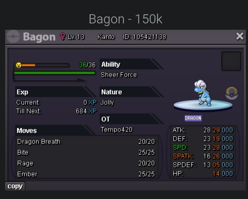 Start Price: 500k End Point: 48 hours (after start price is met) Insta Price: N/A Minimum Raise: 200k Accepted Payments: Pokedollars, Coin Capsules (x1 Coin Capsule = 500k)
