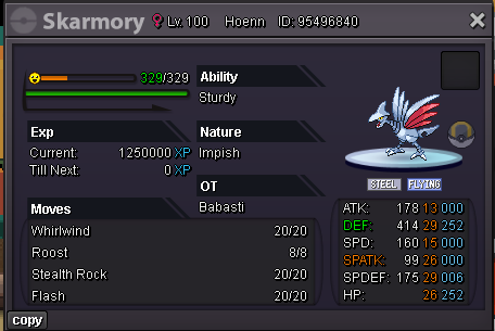 Auction for Skarmory s.o 200k min bet 100k 24hr after start price is met. no insta Payment Pokedollar CC = 500k Remember If a bid is received in the final 15 minutes of the auction, the end point will be delayed by 15 minutes from that bid, and will be delayed by 15 minutes for each new bid thereafter, until the current offer has been held for a full 15 minutes. Good Luck