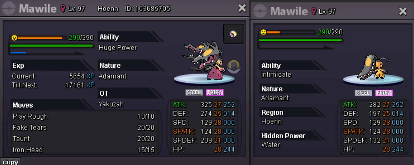 ACCEPT PAYMENT: CC - 500k, Iv reroll - 650k, Nat reroll - 300k, PokeDollars Auction rules: It starts with the first bid and ends 24 hours after the first bid. You can offer any accepted payment method for the amount you prefer. Good luck to all. ( Charizard) S.O: 250k, MIN BID: 50K, INSTA: 1m, TIME: 24H AFTER THE FIRST BID ( Ferrothorn) S.O: 200k, MIN BID: 50K, INSTA: 600k, TIME: 24H AFTER THE FIRST BID ( Hydreigon) S.O: 250k, MIN BID: 50K, INSTA: 800k, TIME: 24H AFTER THE FIRST BID (Manectric) S.O: 250k, MIN BID: 50K, INSTA: 800k, TIME: 24H AFTER THE FIRST BID ( Rotom Wash) S.O: 250k, MIN BID: 50K, INSTA: 1m, TIME: 24H AFTER THE FIRST BID ( Snorlax) S.O: 150k, MIN BID: 50K, INSTA: 500k, TIME: 24H AFTER THE FIRST BID
