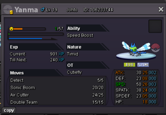 Agresivity started following Yanma Shiny Speed Boost Timid HP Fire