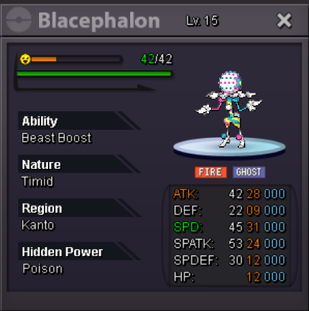 Blacephalon Starting Price : 250k Min. Bid : 50k cc = 450k iv rr = 500k auction will end 48h after fist bid, if someone bids in the last 15 minutes, we will add 15 minutes more to the timer accordingly to auction rules, Thank you and happy biding