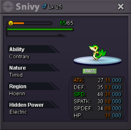 Snivy Starting Price : 400k Min. Bid : 100k cc = 450k iv rr = 500k auction will end 48h after fist bid, if someone bids in the last 15 minutes, we will add 15 minutes more to the timer accordingly to auction rules, Thank you and happy biding