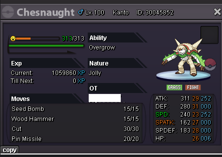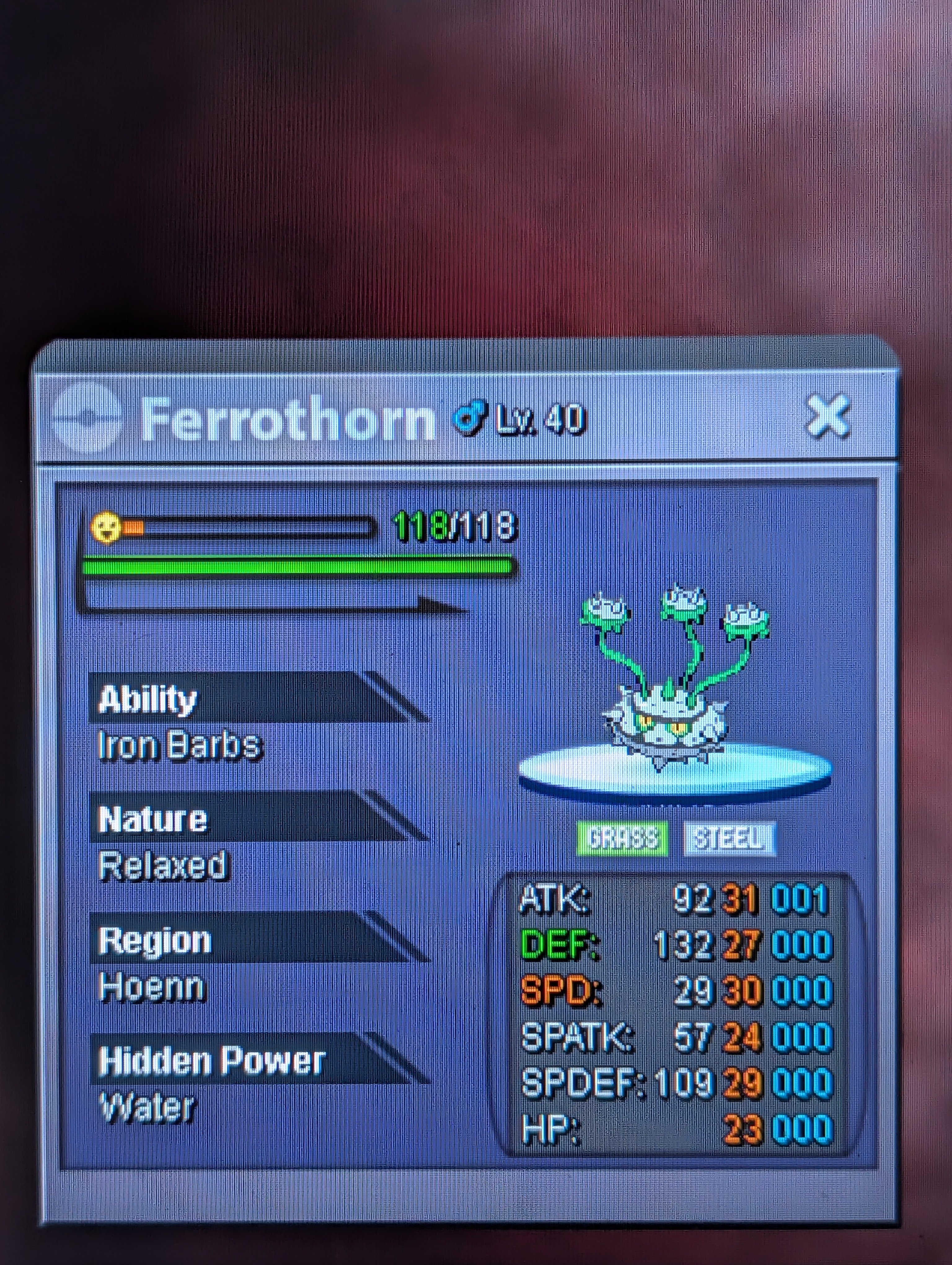Ferrothorn — HP Water — PvP Defensive Build Nature: Relaxed Ability: Iron Barbs Hidden Power: Water Region: Hoenn Perfect for defensive PvP teams (Tank/Support) --- Start price: 600k Min raise: 200k Auction duration: 48 hours after first bid Accepted payments: Pokédollars only Server: Silver