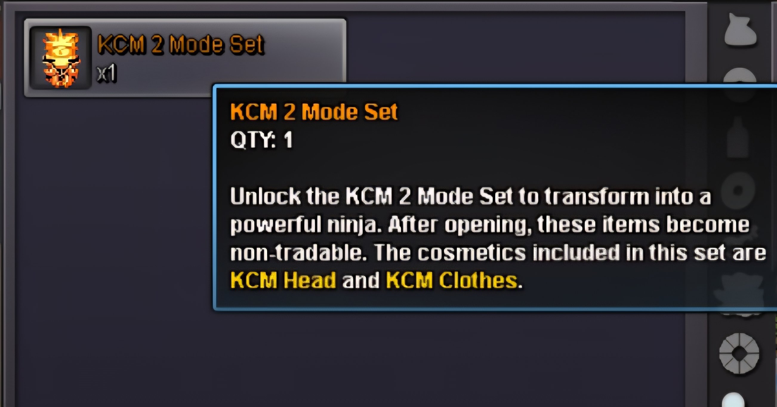 Good day folks! I present to you the Very Rare PVP Chest cosmetic KCM 2 Mode Set! !! After opening, these items become non-tradable. The cosmetics included in this set are KCM Head and KCM Clothes. Both pieces in this set can be worn by male and female characters. The headpiece includes a hairstyle with longer hair for females and shorter hair for males. !! (Copied from Lacomus's post) Starting offer : 20m Timer : 72hrs after first bid, with 15 minute extention if bids are recieved in the last 15 minutes of the auction Insta price : 35m Min raise : 200k Accepted payments : Cash, Coin Capsule (1 cc = 480k), IV-Reroll (1 rr = 700k) You may bid from any server, and I will transfer it over. If you intent to purchase with an alt account, please specify with you bid. Happy Bidding! (っ'ヮ'c)
