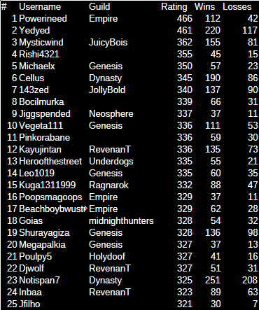 Hello hello everyone! Nice to see familiar faces this season. Like always, I would like to thank everyone for giving PRO a competitive environment for another season. I would also like to congratulate each player and guild who made it to the top of the ladder, on behalf of the whole staff team. We all wish you the best in the next season. Thanks for participating! REWARDS: Normally, 1st Place will receive 600 PvP coins, 2nd place 595, and so on. Top ladder guilds shall receive 25% EXP Boost for the entirety of the next season! Additionally, Top 25 players from each server can: Access Tutor Heaven! In addition with the recent PVP Chests update, the following reward structure will be applied this season, 1st Place: 5× PvP Chests 2nd–3rd Place: 4× PvP Chests 4th–10th Place: 3× PvP Chests 11th–19th Place: 2× PvP Chests 20th–25th Place: 1× PvP Chests RANKED LADDER RESULTS: Top 25 Silver Ranked Rating (No Tier Ladder) Top 25 Gold Ranked Rating (No Tier Ladder) RANKED GUILD LADDER RESULTS: Silver Guild Rating Gold Guild Rating RANDOM RANKED LADDER RESULTS: Top 25 Silver Random Ranked Rating (No Tier Ladder) Top 25 Gold Random Ranked Rating (No Tier Ladder) Disclaimer: Results may have a marginal difference to ones recorded by other players. The results taken were taken seconds before the ladder was reset, whilst the servers were offline. If you used a Discord bot, or gathered your own screenshots earlier than us, your results may be inaccurate. Please note that users with the exact same rating may switched positions during the reward process, we have no influence over that.