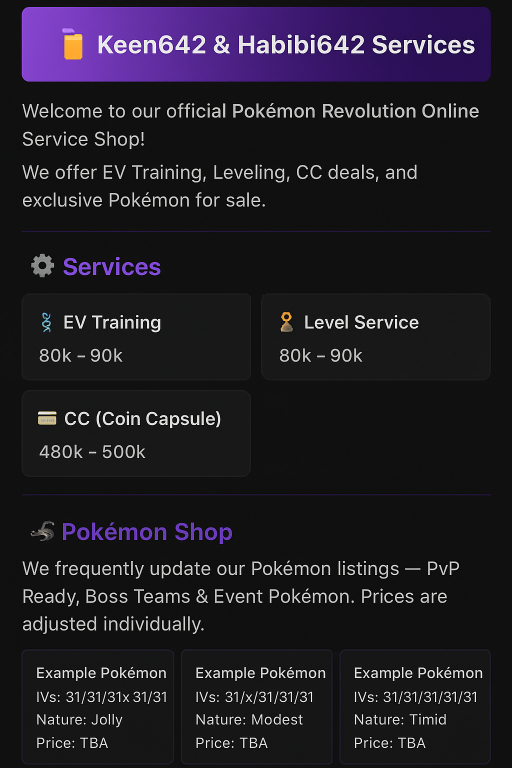 Keen642 & Habibi642 WELCOME ALL TO THE JUICE STAND! Rules I would like to state: - This shop is in SILVER if you are from GOLD you have to TRANSFER - NO criticism on prices! - NO fake offers (will be reported) - ONCE OFFERED YOU CANNOT TAKE IT BACK -ALL prices are NEGOTIABLE - Pokemon can be purchased through ITEMS and POKEDOLLARS ACCEPTED PAYMENTS : - POKEDOLLARS - COIN CAPSULE (CC) = 480k - IV REROLL = 650k - RARE CANDY (RC) = 6.5K HOW TO CONTACT US: Can also message us here Discord : jta_timi, keen642 Ingame Name : keen642 or habibi642 480k each or 6.5k each or 2.35M for all 275k for all Crobat: Koffing: Mankey Adamant 300k Timid 1.5M (Make offer) Hypno: Ninetales: Shiny Gastly Mild 800k Mild (Make offer) Timid (Make offer)