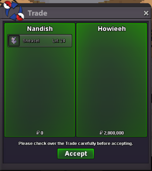 Alt account: Auctioneer (Gold Server) Auction Details: Start Price: 500k End Point: 15 hours (after start price is met) Insta Price: N/A Minimum Raise: 100k Accepted Payments: Pokedollars, Coin Capsules (x1 Coin Capsule = 480k), IV Reroll Tickets (x1 IV Reroll Ticket = 730k) Important Reminders: This is a Gold Server auction. If bidding from an alternative server, state that you will transfer upon winning. If you intend to purchase with an alt account, specify the account alongside your bid. If a bid is received in the final 15 minutes of the auction, the end point will be delayed by 15 minutes from that bid, and will be delayed by 15 minutes for each new bid thereafter, until the current offer has been held for a full 15 minutes. Happy Bidding!