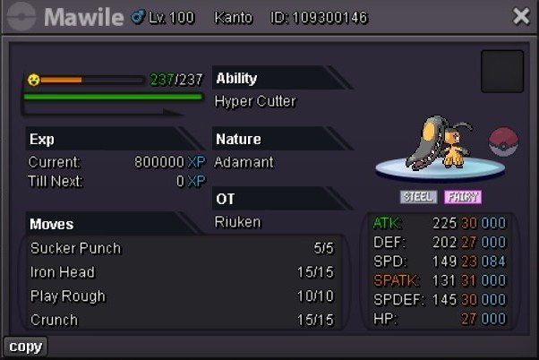 Auction Details Start Price: 15m End Point: 48 Hours (after start) Insta Price: no insta Minimum Raise: 200K Accepted Payments: Pokedollars, cc=480k, rr=700k Server Name: gold Important Reminders This is a Cross Server auction. You may bid from any server and i will transfer upon winning the auction. If you intend to purchase with an alternate account or from other server, please specify the account name and/or server name alongside your bid. 15 minutes rule is applied. (If a bid is received in the final 15 minutes of the auction, the end point will be delayed by 15 minutes from that bid, and will be delayed by 15 minutes for each new bid thereafter, until the current offer has been held for a full 15 minutes) Please check the Trade Rules and Auction Rules if you are new to trading in PRO