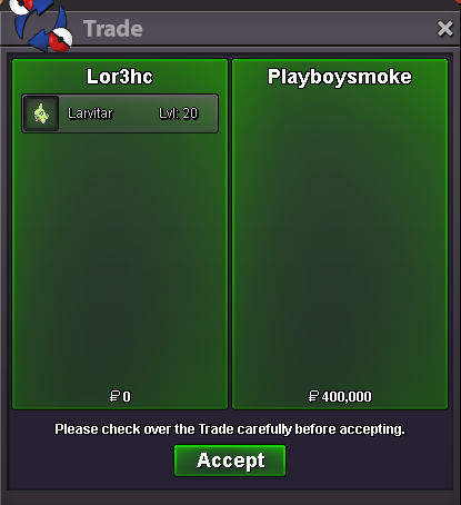 Hello @Rudedingo22 I have force the Trade of the Pokemon Ferrothorn. 200k have been deducted from @Bugiwara01's Account. 200k have been added to @Rudedingo22's Account. Ferrothorn has been transfered to @Bugiwara01's Account. Kinda Regards Glitterwing