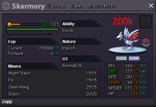 Start Price: 100k End Point: 48 hours (after start price is met) Insta Price: 1m Minimum Raise: 50k Accepted Payments: Pokedollars, Coin Capsules (x1 Coin Capsule = 500k), IV Reroll Tickets = x1 IV Reroll Ticket = 750k) Important Reminders: This is a Silver Server auction. If bidding from an alternative server, state that you will transfer upon winning. If a bid is received in the final 15 minutes of the auction, the end point will be delayed by 15 minutes from that bid, and will be delayed by 15 minutes for each new bid thereafter, until the current offer has been held for a full 15 minutes.