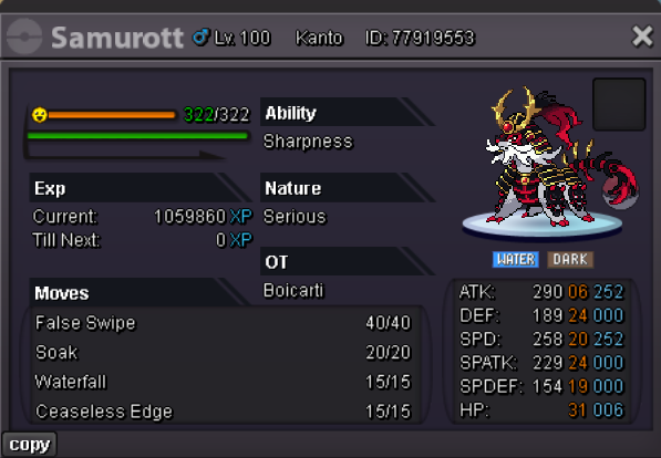 Auction Details Start Price: 5m End Point: 48 Hours (after start) Insta Price: N/A Minimum Raise: 200K Accepted Payments: Pokedollars / 1x CC = 500K / 1x IV RR = 700K Server Name: Gold Important Reminders This is a Gold Server auction. You may bid from any server but you must transfer to Gold Server upon winning the auction. If you intend to purchase with an alternate account or from other server, please specify the account name and/or server name alongside your bid. 15 minutes rule is applied. (If a bid is received in the final 15 minutes of the auction, the end point will be delayed by 15 minutes from that bid, and will be delayed by 15 minutes for each new bid thereafter, until the current offer has been held for a full 15 minutes). Please check the Trade Rules and Auction Rules if you are new to trading in PRO.