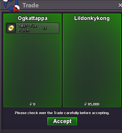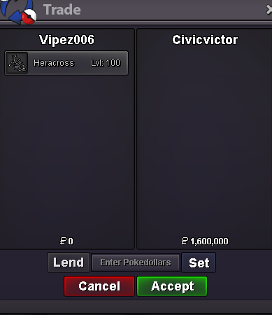 Start Price: 10m End Point: 48 hours (after starting price is met) Minimum Raise: 250k Accepted Payments: Pokedollars, Coin Capsules (x1 Coin Capsule = 500k).