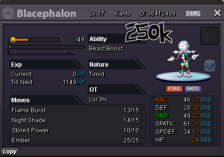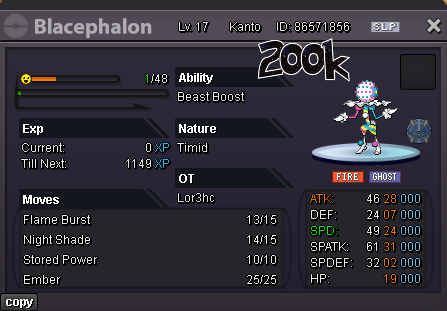 Daily new mons (10/11) On list • Blacephalon (Timid/Beast Boost) • Electrike (Naive/Static) • Mothim (Timid/Tinted Lens) • Teddiursa (Adamant/Pickup) • Ursaring (Adamant/Guts) Fully Trained • Rotom (Bold/Levitate) • Sceptile (Swiper) Clothes & Mount