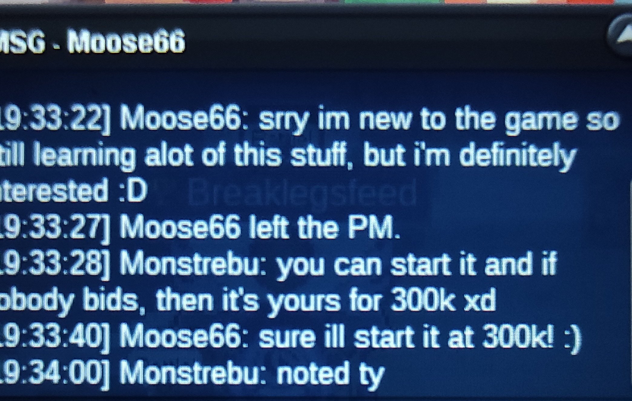 Starting bid: 300k Min raise: 50k Insta: 2m Duration: 48 h after starting bid is met Accepted payments: CC = 500k IV reroll = 700k