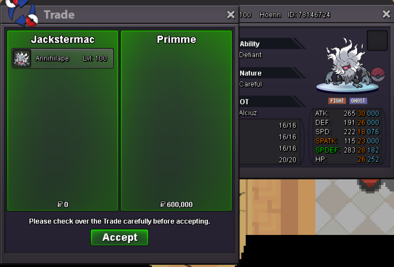 Auction Chesnaught Hlw (Careful Overgrow)Larfleeze replied to Ovanke's topic in Shiny and Special Pokémon - Gold Hello, If you ever need help setting up an auction my discord DM's are open for helping review auctions that you want to set up. Do not take it out on another player for calling out a mistake before it became a situation when the staff team need to intervene and reverse. @Jackstermac in the future just report. We'll always handle the requests in a timely manner, and we pride ourselves on sticking to the evidence provided. The result would have been the same even if we had to intervene. Very Respectfully, Larfleeze