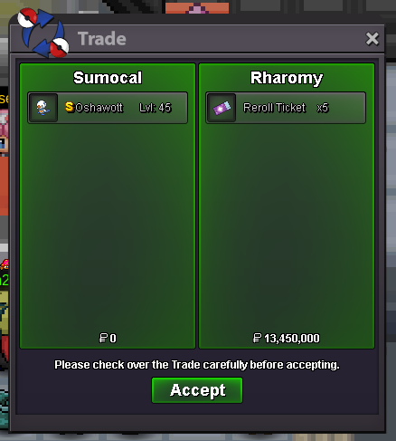 3. Auction Details: Start Price: 2M End Point: 48 hours (after start price is met) Insta Price: N/A Minimum Raise: 100k Accepted Payments: Poke Dollars, Coin Capsules (x1 Coin Capsule = 480k) Time Left: Important Reminders - This is a Gold Server auction. You may bid from any server but you must transfer to Gold Server upon winning the auction. - If you intend to purchase with an alternate account or from other server, please specify the account name and/or server name alongside your bid. - 15 minutes rule is applied. (If a bid is received in the final 15 minutes of the auction, the end point will be delayed by 15 minutes from that bid, and will be delayed by 15 minutes for each new bid thereafter, until the current offer has been held for a full 15 minutes)