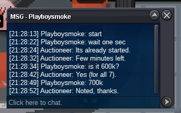 s.o 350k min bid 50k duration: 24hours after first bid accepted payments: cc - 475k, rr iv 700k, pokedollars 15minutes rule