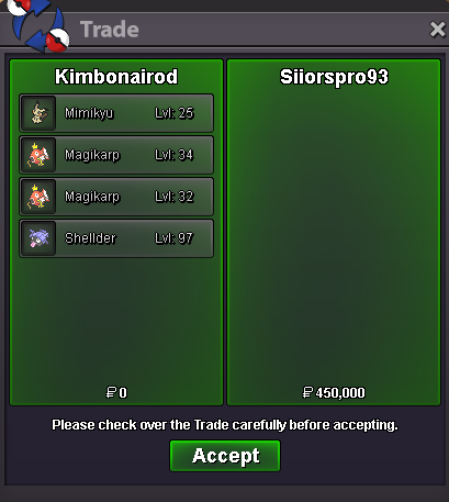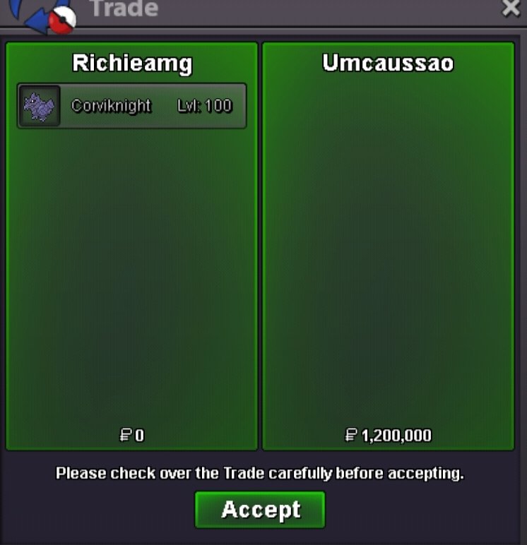 Auction Details: Start Price: 5M End Point: 72 hours (after start price is met) Insta Price: 8M Minimum Raise: 100k Accepted Payments: Pokedollars. RR = 700K , CC = 500k Important Reminders: This is a Gold Server auction. If bidding from an alternative server, state that you will transfer upon winning. If you intend to purchase with an alt account, specify the account alongside your bid. If a bid is received in the final 15 minutes of the auction, the end point will be delayed by 15 minutes from that bid, and will be delayed by 15 minutes for each new bid thereafter, until the current offer has been held for a full 15 minutes.