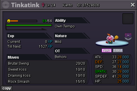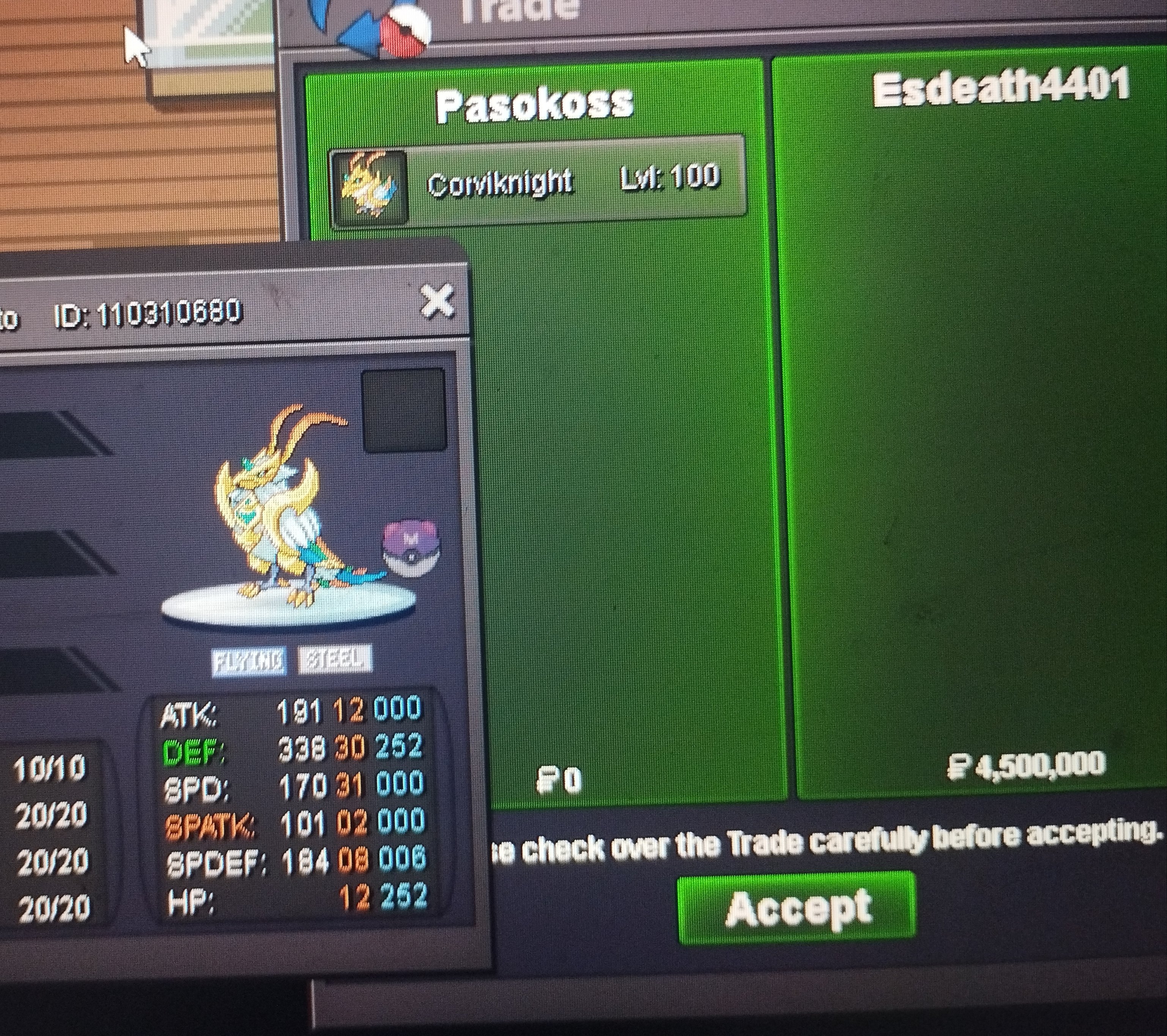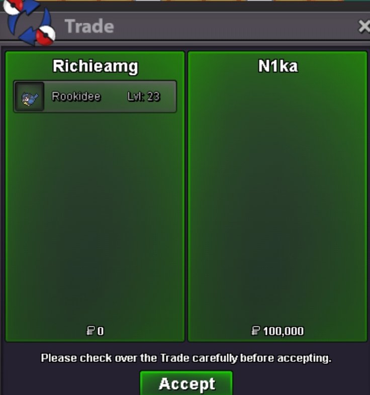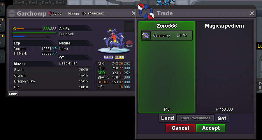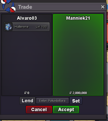 Starting Offer: 50k Min Raise: 10k No Insta Ends: 24hrs after start Accepted Payments IV Reroll - 700k Nat Reroll - 350k CC - 450k RC - 5k Pokedollars