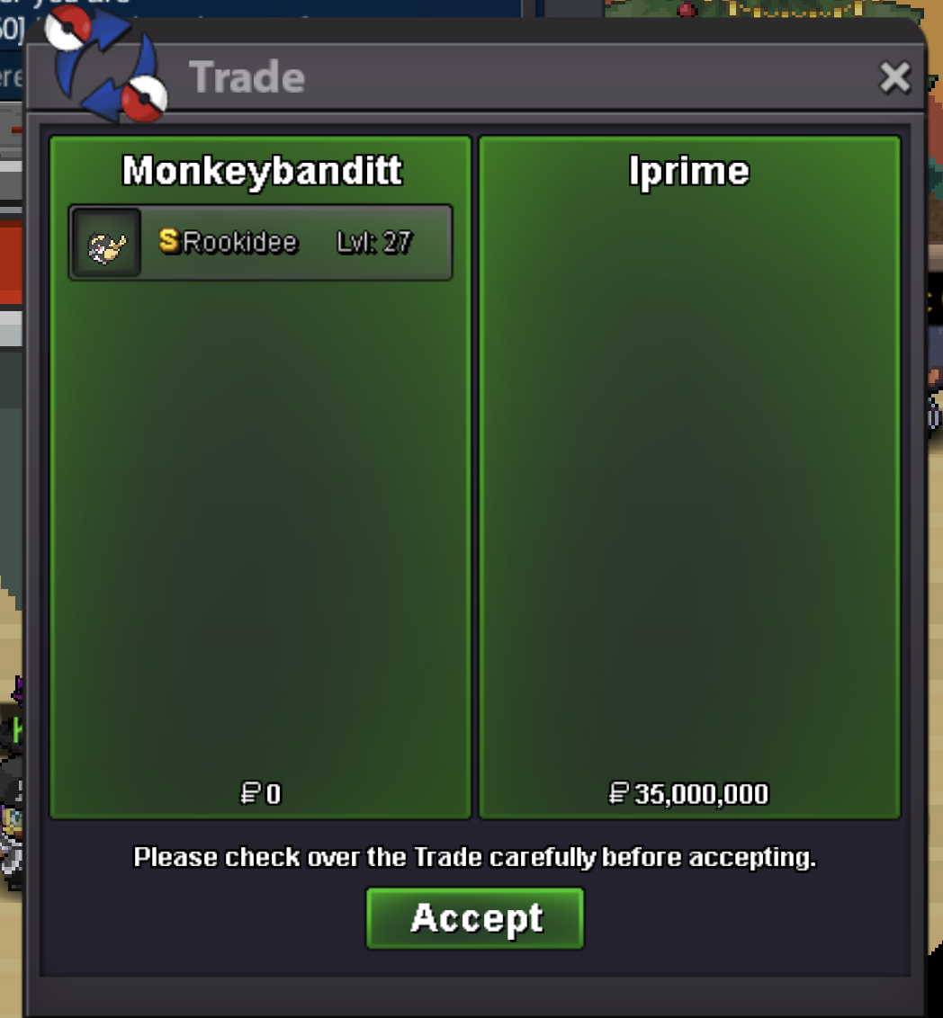 Auction Details: Start Price: 1.5m End Point: 36 hours (after start price is met) Insta Price: N/A Minimum Raise: 100k Accepted Payments: Pokedollars, Coin Capsules (x1 Coin Capsule = 500k), IV Reroll Tickets (x1 IV Reroll Ticket = 700k) Important Reminders: If you intend to purchase with an alt account, specify the account alongside your bid. If a bid is received in the final 15 minutes of the auction, the end point will be delayed by 15 minutes from that bid, and will be delayed by 15 minutes for each new bid thereafter, until the current offer has been held for a full 15 minutes. Happy Bidding!