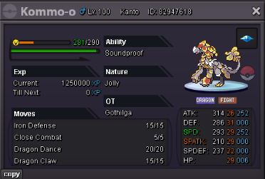 1) Assault vest Tank tyranitar : pursuit trap + stealth rock +flamthrower + ice beam S.o : 600k - minimum bid: 100k 2) Dragon dance Kommo-o : soundprouf nature to stop Other kommos from Z-moving and boost dragon dance on them (can be played close combat or drain punch) S.o : 500k - minimum bid: 100k 3) Tank clodsire water absorb : good def , hp , spdef S.o : 300k - minimum bid: 100k 4) Alakazam h.a magic guard : S.o : 1m - minimum bid: 100k 5) Pink Parasect : dry skin false sweep + spore S.o : 400k - minimum bid: 100k auction end 3 days after first bid enjoy