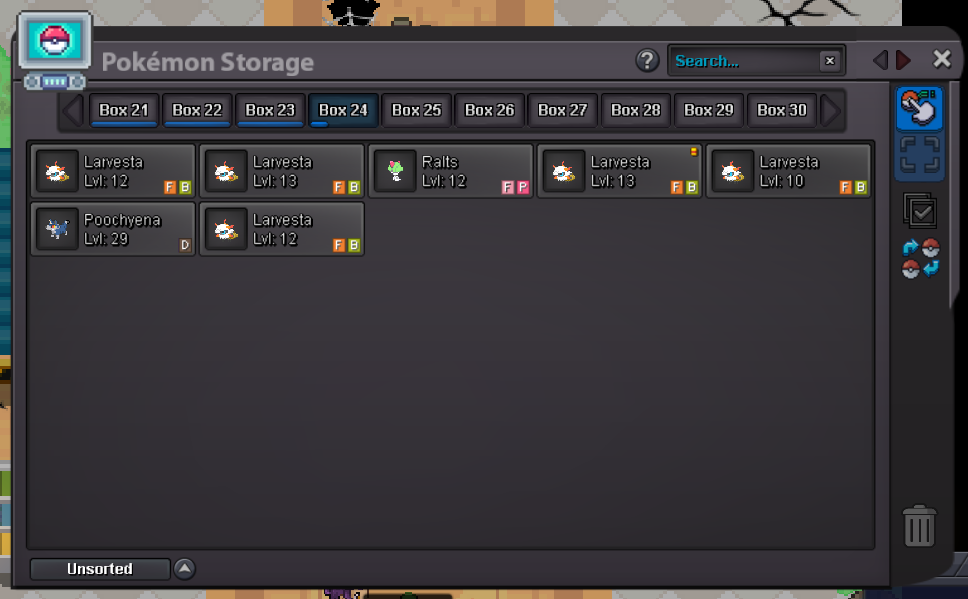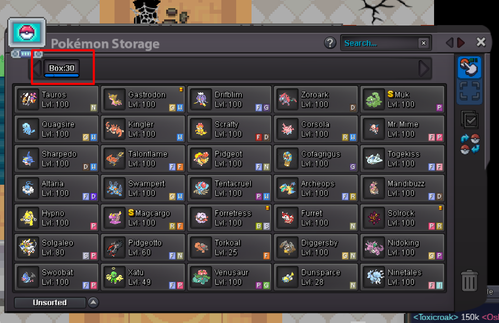 Hi everyone, I believe my Pokémon storage is bugged. All of my boxes are merged into a single one showing as BOX30. I tried relogging and changing the settings, but it didn’t go back to normal.