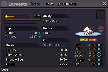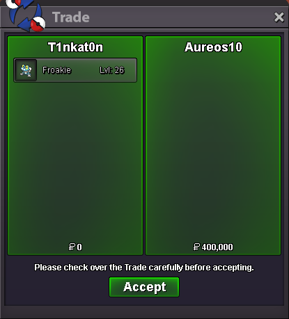 Hello @Babasti I have force the Trade of the Cutiefly 350k have been deducted from @Artiga24's Account. 350k have been added to @Babasti's Account. Cutiefly has been transfered to @Artiga24's Account Kinda Regards Glitterwing -