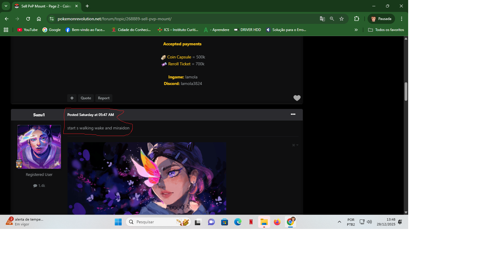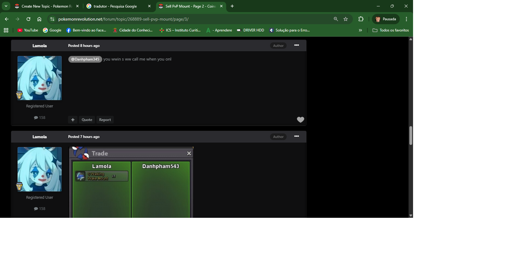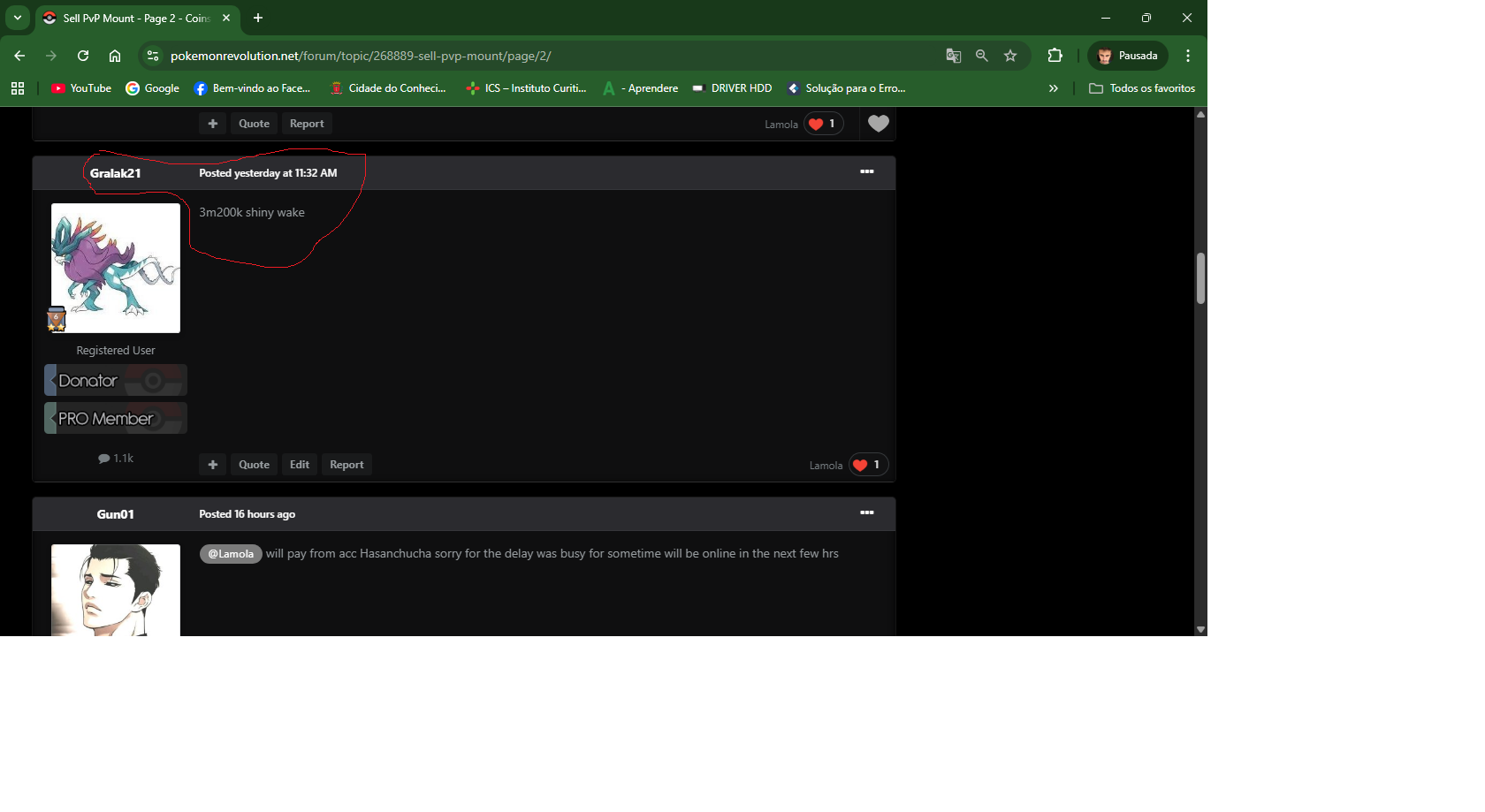 I want you to check the time Suzu sent the bid. There was a Wake diamond auction going on, which I waited 48 hours for, and I went to sleep an hour before it ended. His bid arrived 8 hours after my offer, but still within the closing time. However, the auction ended at 5:47 AM, as you can see from the start. After that time, 6 AM, it's not within the 48-hour auction window, and my offer remains the last one. start auction, time 48hrs, my offer, more bids, Here at this point I want you to check if the bid he offered is still within the time limit because he went to finalize the auction many hours after it ended and continues posting offers, not Suzu but the auction owner. If Suzu's offer isn't valid, I win. I want you to show me a screenshot of the exact time he sent his offer, just like in the start. https://pokemonrevolution.net/forum/topic/268889-sell-pvp-mount/page/3/ Sincerely, your auction buddy, Gralak21