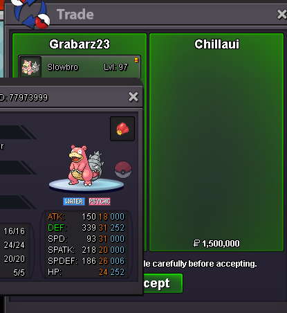 Auction Details: Start Price: 1,5m End Point: 40 hours (after start price is met) Insta Price: 10m Minimum Raise: 200k Accepted Payments: Pokedollars, Coin Capsules (x1 Coin Capsule = 500k), IV Reroll Tickets (x1 IV Reroll Ticket = 750k) Important Reminders This is a silver Server auction. You may bid from any server but you must transfer to silver Server upon winning the auction. If you intend to purchase with an alternate account or from other server, please specify the account name and/or server name alongside your bid. 15 minutes rule is applied. (If a bid is received in the final 15 minutes of the auction, the end point will be delayed by 15 minutes from that bid, and will be delayed by 15 minutes for each new bid thereafter, until the current offer has been held for a full 15 minutes) Please check the Trade Rules and Auction Rules if you are new to trading in PRO
