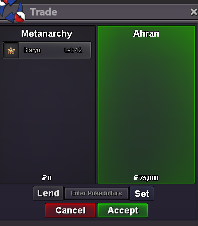 Start Point/Price: 5m End Point: 48 hours from the first bid Min. Raise: 100k Accepted Payment: Pokedollars, CC 520k RR 700k If a bid is received in the final 15 minutes of the auction, the end point will be delayed by 15 minutes from that bid, and will be delayed by 15 minutes for each new bid thereafter, until the current offer has been held for a full 15 minutes.