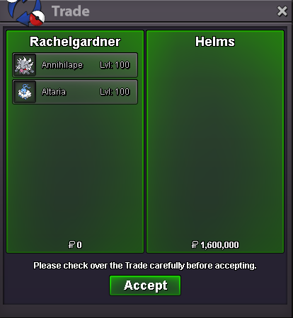 Start Price: 900k End Point: 48 hours (after start price is met) Insta Price: N/A Minimum Raise: 200k Accepted Payments: Pokedollars, Coin Capsules (x1 Coin Capsule = 500k)