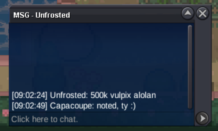 Welcome ^^ Start Price: 1m End Point: 24 hours (after start price is met) Insta Price: N/A Minimum Raise: 200k Accepted Payments: Pokedollars, Coin Capsules (x1 Coin Capsule = 500k), IV Reroll Tickets (x1 IV Reroll Ticket = 700k)