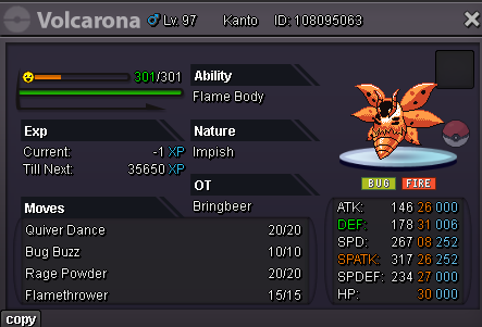 Start Price: 200k End Point: 15min after start price is meet Minimum Raise: 20k Accepted Payments: Pokedollars, Coin Capsules (x1 Coin Capsule = 500k), iv rr = 700k Important Reminders: This is a Silver Server auction. If bidding from an alternative server, state that you will transfer upon winning. If a bid is received in the final 15 minutes of the auction, the end point will be delayed by 15 minutes from that bid, and will be delayed by 15 minutes for each new bid thereafter, until the current offer has been held for a full 15 minutes.