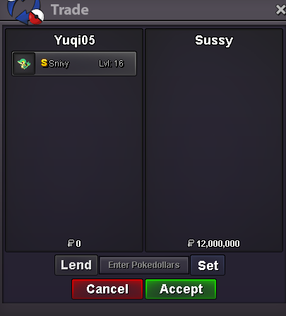 Alt account: Sumocal (Silver Server) Auction Details: Start Price: 2m End Point: 72 hours (after start price is met) Insta Price: N/A Minimum Raise: 200k Accepted Payments: Pokedollars, Coin Capsules (x1 Coin Capsule = 500k), IV Reroll Tickets (x1 IV Reroll Ticket = 750k) Important Reminders: This is a Cross Server auction. You may bid from any server, and I will transfer to your preferred server upon winning. If you intend to purchase with an alt account, specify the account alongside your bid. If a bid is received in the final 15 minutes of the auction, the end point will be delayed by 15 minutes from that bid, and will be delayed by 15 minutes for each new bid thereafter, until the current offer has been held for a full 15 minutes. Happy Bidding!