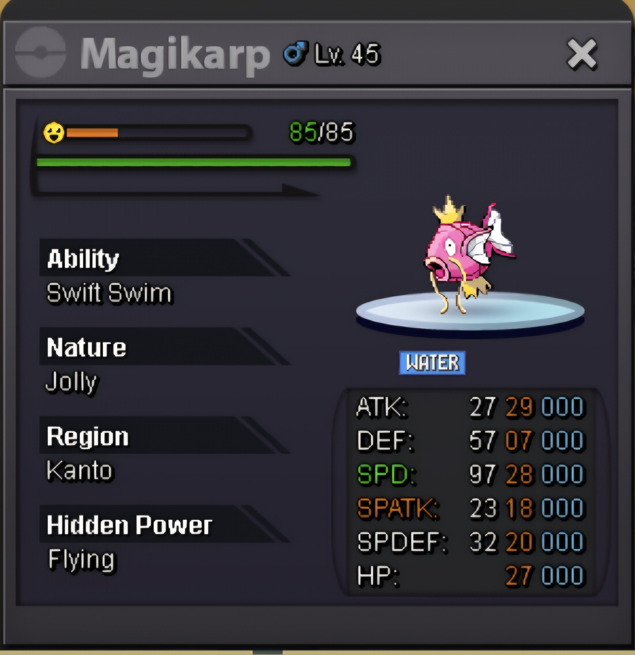 [PVPABLE JOLLY MAGIKARP | SEMI EPIC | 29ATK | 28 SPD] Start Point: 50k End Point: [48 hours after start is met] Insta: N/A Min. Raise: 50k Accepted Payment(s): Poke dollars , Coin Capsules ( 1 x Coin Capsule = 500k ), IV Reroll ( 1 x IV Reroll = 700k ) Important Reminders - This is a Gold Server auction. You may bid from any server but you must transfer to Gold Server upon winning the auction. - If you intend to purchase with an alternate account or from other server, please specify the account name and/or server name alongside your bid. - 15 minutes rule is applied. (If a bid is received in the final 15 minutes of the auction, the end point will be delayed by 15 minutes from that bid, and will be delayed by 15 minutes for each new bid thereafter, until the current offer has been held for a full 15 minutes) - Please check the Trade Rules and Auction Rules if you are new to trading in PRO. Again, thank you for all the support. To all bidders and viewers, Enjoy the Auction, Happy Bidding.