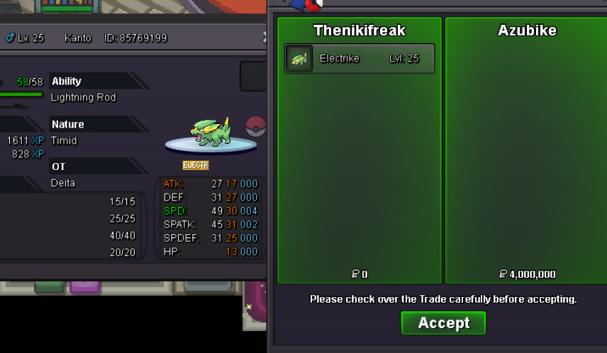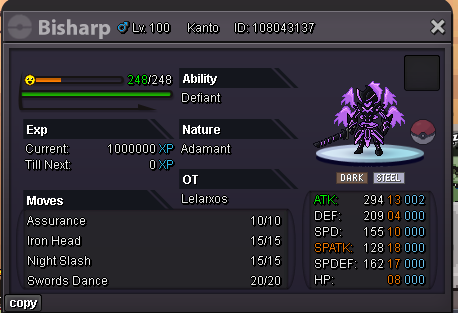 Auction Details: S.O: 750k End Point: 48 hours (after start bid) Insta Price: 2m5 Minimum Raise: 50k Accepted Payments: Pokedollars, Coin Capsules (470k), IV RR (700k), Nat RR (350k) *"If a bid is placed within the last 15 minutes of the auction, the end time will be extended by 15 minutes from the most recent valid bid, and will continue to extend by 15 minutes for each new bid thereafter until the highest offer has stood for a full 15 minutes."