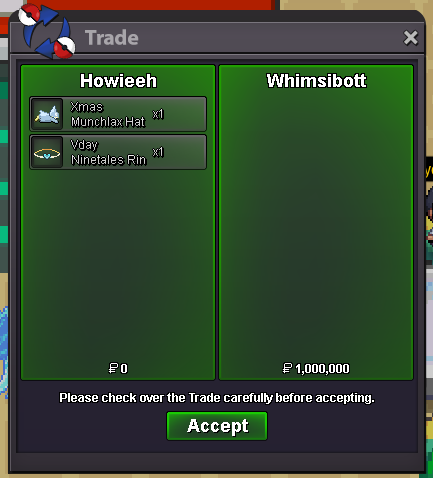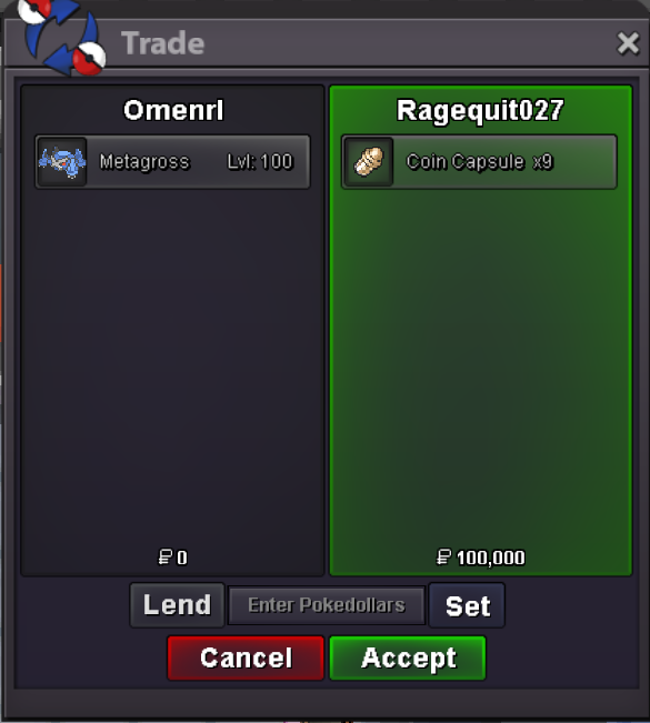 Start Price: 1M End Point: 48 hours (after start price is met) Insta Price: No Minimum Raise: 100k Accepted Payments: Pokedollars / 1x CC = 450k / 1x Nature RR = 250k / 1x IV RR = 700k